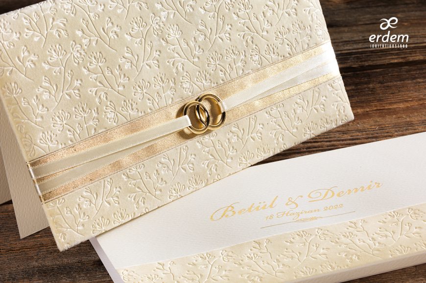 Le second élément est la plaque entièrement recouverte de velours ivoire. Ainsi, la plaque se plie en deux. Par dessus il faut coller la feuille du faire part. Sur le devant de la plaque, deux anneaux de couleurs or sont attachés par un ruban beige.