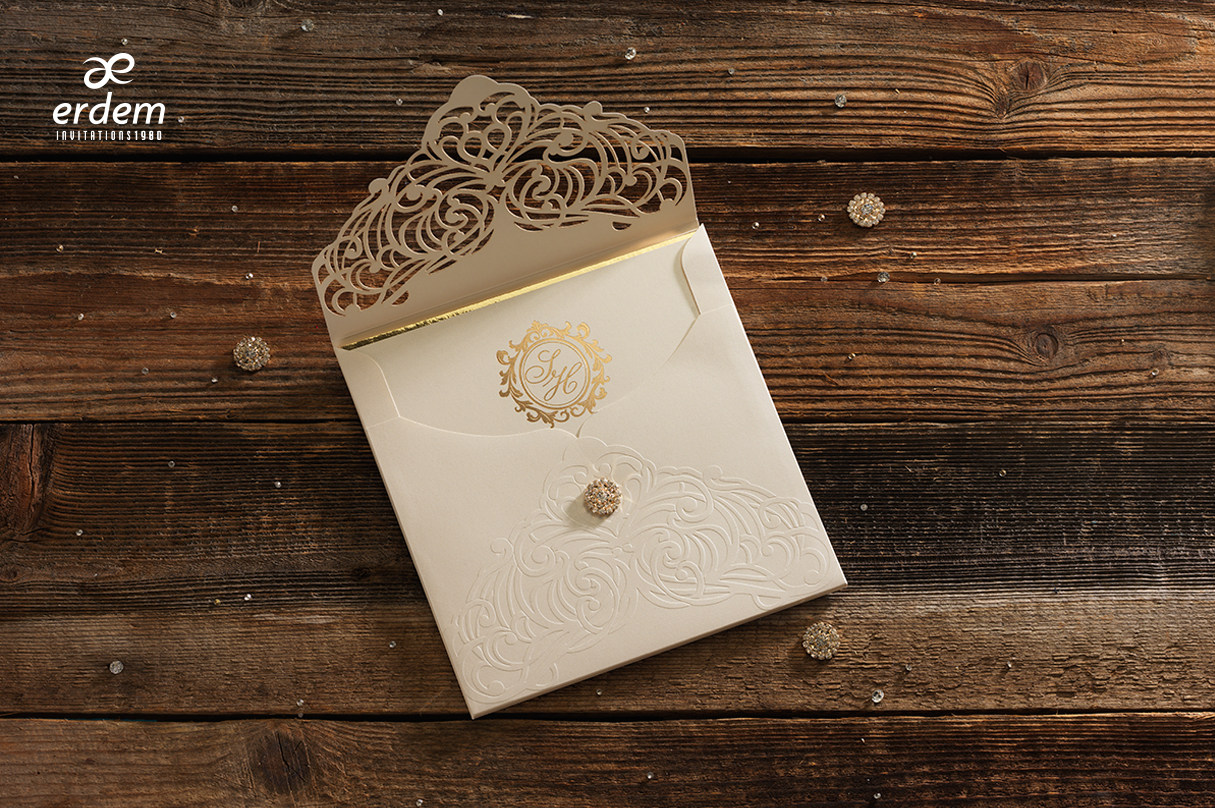 Puis le troisième élément est la pochette toute en dentelure. Elle est ciselé sur le rabat qui est en forme de triangle tel une enveloppe. Ainsi on peut également remarquer le rabat est recouvert de paillettes. C’est ce qui donne ce coté classe et chic au faire part.